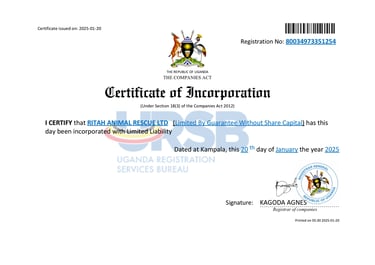 Ritah Animal Rescue is fully registered and compliant with the Government of Uganda, ensuring our operations meet the highest standards of legitimacy and transparency.